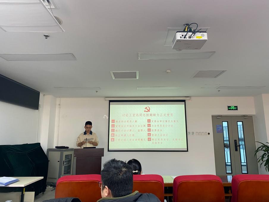 会议讨论了王宏远同志、冯宇宸同志转为正式党员的事项。按照组织发展程序,王宏远、冯宇宸分别汇报了一年来的思想和工作情况。入党介绍人介绍了对王宏远、冯宇宸同志的培养考察情况,并表示同意转为正式党员。经支部党员的充分讨论和投票表决,一致同意接收王宏远同志、冯宇宸同志为中国共产党正式党员。
