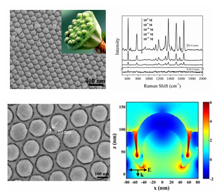 近期,中国科学院理化技术研究所贺军辉课题组受自然界莲蓬结构的启发,设计了一种新颖的仿生莲蓬结构SERS基底。该基底具有可控的纳米间隙,有限时域差分计算(FDTD)证实均匀分布的小于10 nm的环状间隙显著增强了局域电磁场。该基底对于罗丹明6G的检测限达到了10-12 M并且相对标准偏差为4.1%-8.0%。罗丹明6G的拉曼信号强度与其浓度具有良好的线性关系,所以该SERS基底可用于定量拉曼检测。更为重要的是,该基底可用于类蛋白-β寡聚物的检测,因此在阿尔兹海默症早期检测方面具有应用前景。