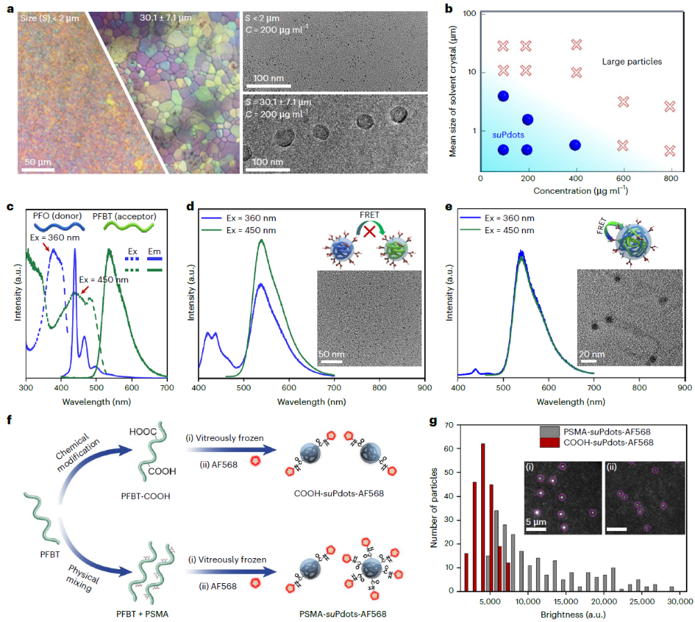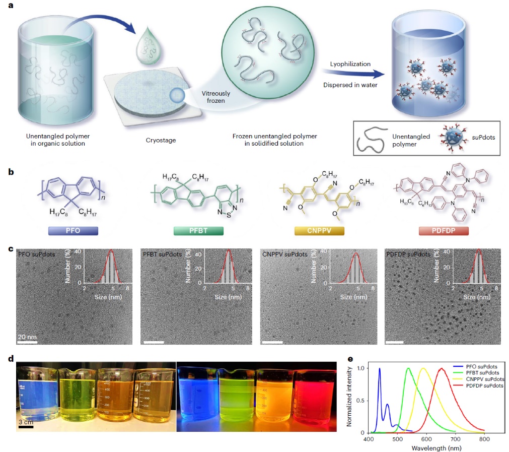 近日,中国科学院理化技术研究所前沿交叉研究中心王健君研究员团队联合中国科学院杭州医学研究所方晓红研究员团队,在深入揭示冰晶成核与生长机制的基础上(Nature 2019, 576, 437–441; Sci. China Chem., 2019, 62: 909–915),发明冷冻组装策略(Ostwald Ripening Induced Nanoparticles, ORIN; Nat. Commun. 2017, 8, 15154; ACS Nano 2017, 11, 10, 9898–9905; Angew. Chem. Int. Ed. 2020, 59, 15141-15146; Nano Lett. 2023, 23, 1030-1035; Sci. China. Chem. 2023, 66, 878-886; J. Am. Chem. Soc. 2025,147,12730-12739),将单条有机荧光聚合物链制备成尺寸<5 nm的单链超小荧光聚合物纳米点(suPdots)。这些suPdots组成明确、表面易修饰、荧光发射可调、高亮度和优异光稳定性,为先进荧光显微成像提供了一类强大的探针工具。