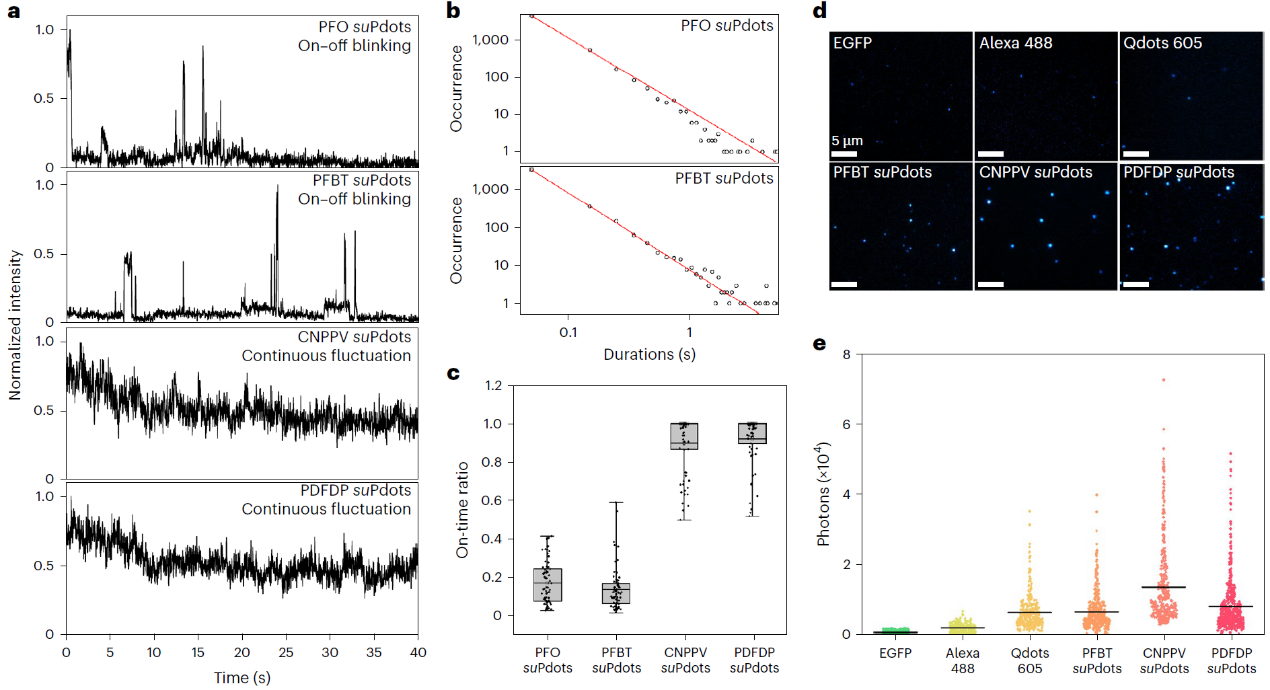 在性能设计与功能优化上,suPdots展现出显著优势:其一,探针选材兼顾实用性与多样性,选用可商业化获取的共轭聚合物链,且荧光光谱覆盖全光谱范围,满足不同场景的成像需求;其二,光物理特性优异,单颗粒亮度约为绿色荧光蛋白(EGFP)的15倍,且不同结构的荧光聚合物链可呈现差异化单颗粒光学行为(如On-Off闪烁、稳定荧光发射),能根据具体成像应用需求灵活选取与调控;其三,表面修饰精准可控,通过对单链聚合物进行特定官能团修饰,可实现suPdots的定量靶向修饰—将其与抗体偶联后,能够对多种亚细胞结构进行高特异性、高密度标记。在实际应用中,suPdots的性能优势进一步凸显:借助受激辐射损耗(STED)超分辨荧光显微成像技术,该探针成功揭示了网格蛋白包被内凹小体的中空环状结构;更重要的是,依托suPdots的高亮度与超小尺寸优势,研究团队使用常规转盘共聚焦荧光显微镜,以50赫兹的时间分辨率和约8纳米的定位精度,清晰解析了单个驱动蛋白在活细胞内的运动步长。这一突破克服了此前研究对复杂且昂贵的MINFLUX超分辨成像仪器的依赖,充分彰显了suPdots在推动纳米尺度单分子水平生物分子研究中的巨大潜力。