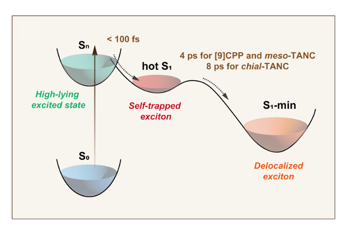 近日,中国科学院理化技术研究所超分子光化学研究中心丛欢研究员课题组与华东师范大学、北京大学的科研团队合作,发展了大环轴向共价键连的合成策略,成功制备了两种同分异构的管状全苯纳米碳(Tubular All-Benzene Nanocarbon,TANC),并首次揭示了其激发态手性动力学演变的机制。