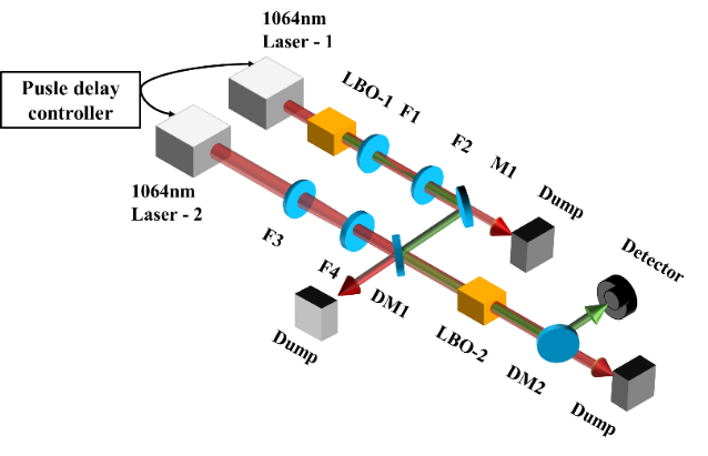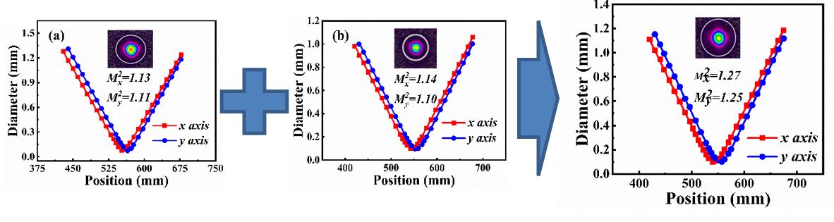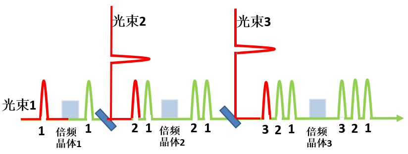 该激光合束新方法基本原理可归纳为一定条件下倍频过程的非逆性,即当一束激光以高效产生倍频光的功率密度通过非线性晶体后,倍频激光再以相同的功率密度通过同样的非线性晶体时不会发生逆转换,而是近乎无损地通过非线性晶体。利用这个特性,研究人员可以不断地将基频激光共轴添加到已有的倍频激光束重复倍频过程,从而完成多束谐波激光的共轴合束,功率无损叠加的同时其光束质量可保持与单束子激光束相同。