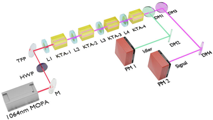 在该项工作中,研究团队联合安徽华创鸿度光电科技有限公司进行了实验验证。使用一台重复频率为1 MHz的1064 nm皮秒激光器泵浦一个由四块KTA(磷酸氧钛砷酸钾)晶体构成的周期性阵列。整个参量变频装置的物理长度仅为27 cm。该装置成功产生了脉冲宽度短至3 ps、脉冲能量达2.6 μJ 的1.5 μm信号光输出,光束质量近衍射极限(