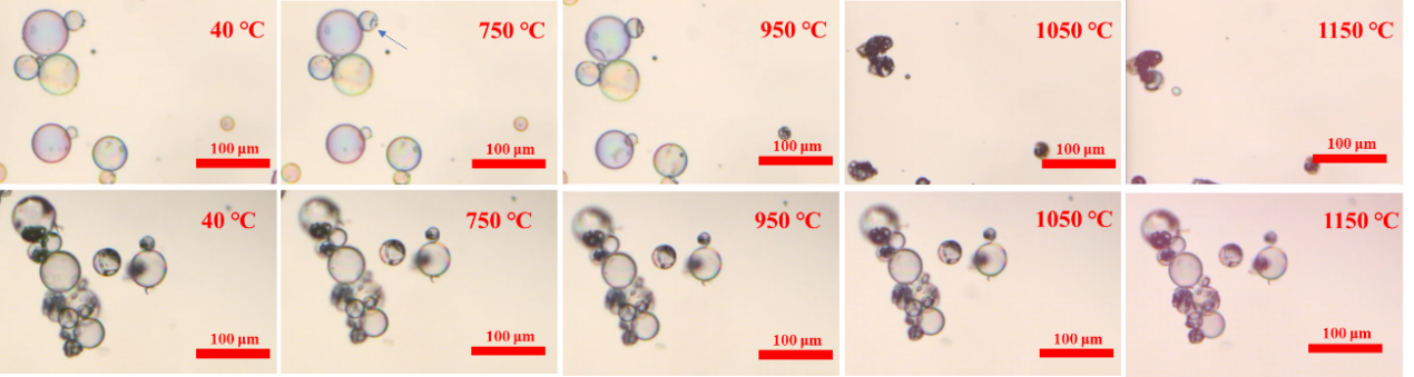 图6 空心玻璃微球(上)和空心氧化铝微球(下)高温热稳定对比