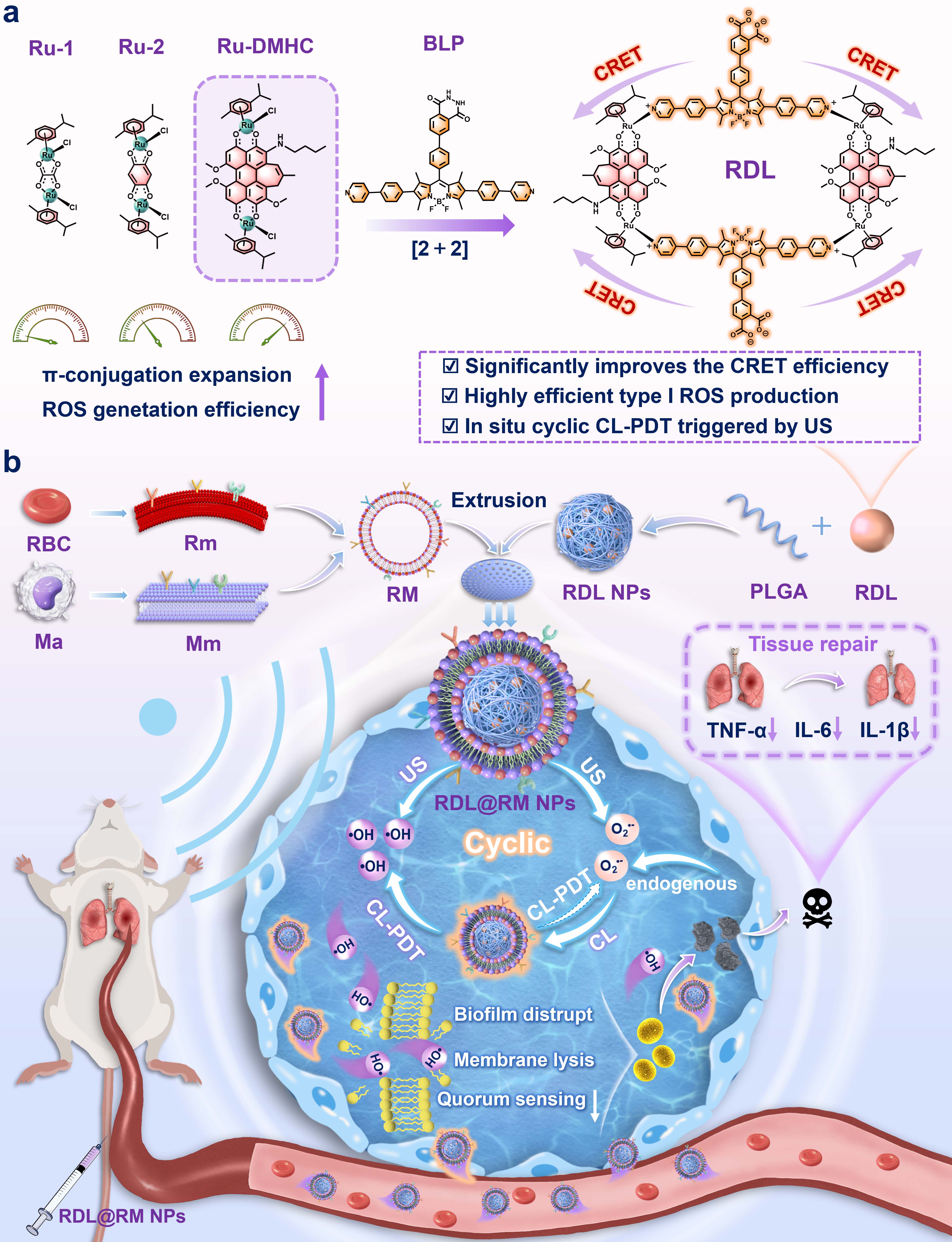 为提升RDL的靶向效率,研究团队通过杂化细胞膜外壳包覆策略构建了仿生靶向纳米颗粒RDL@RM NPs,可实现对炎症部位的靶向和富集,进而通过化学发光介导的光动力治疗有效根除深部缺氧组织中的病原体。