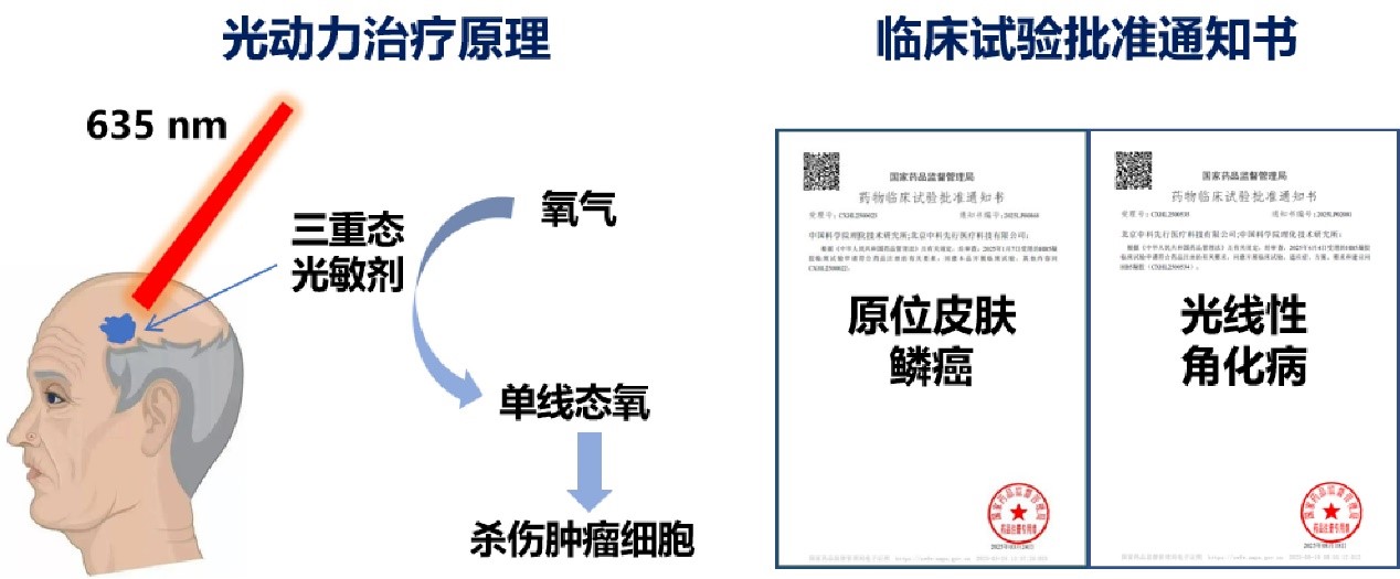 光电信息材料与器件研究中心汪鹏飞研究员团队近十年开展了深入的临床前研究,取得了国际领先的原创成果,获得了一系列具有临床应用价值的潜在药物。其中,用于治疗皮肤鳞癌及癌前病变的光疗药物,于2025年3月、8月分别获得国家药品监督管理局批件,正在开展I期临床试验,相关成果已落实产业化转化,实现了理化所在竹红菌素类光疗药物的里程碑式突破,有望发展出我国独特的新型系列原研光疗药,打破我国光疗药缺乏的局面,推动光动力治疗领域的发展。