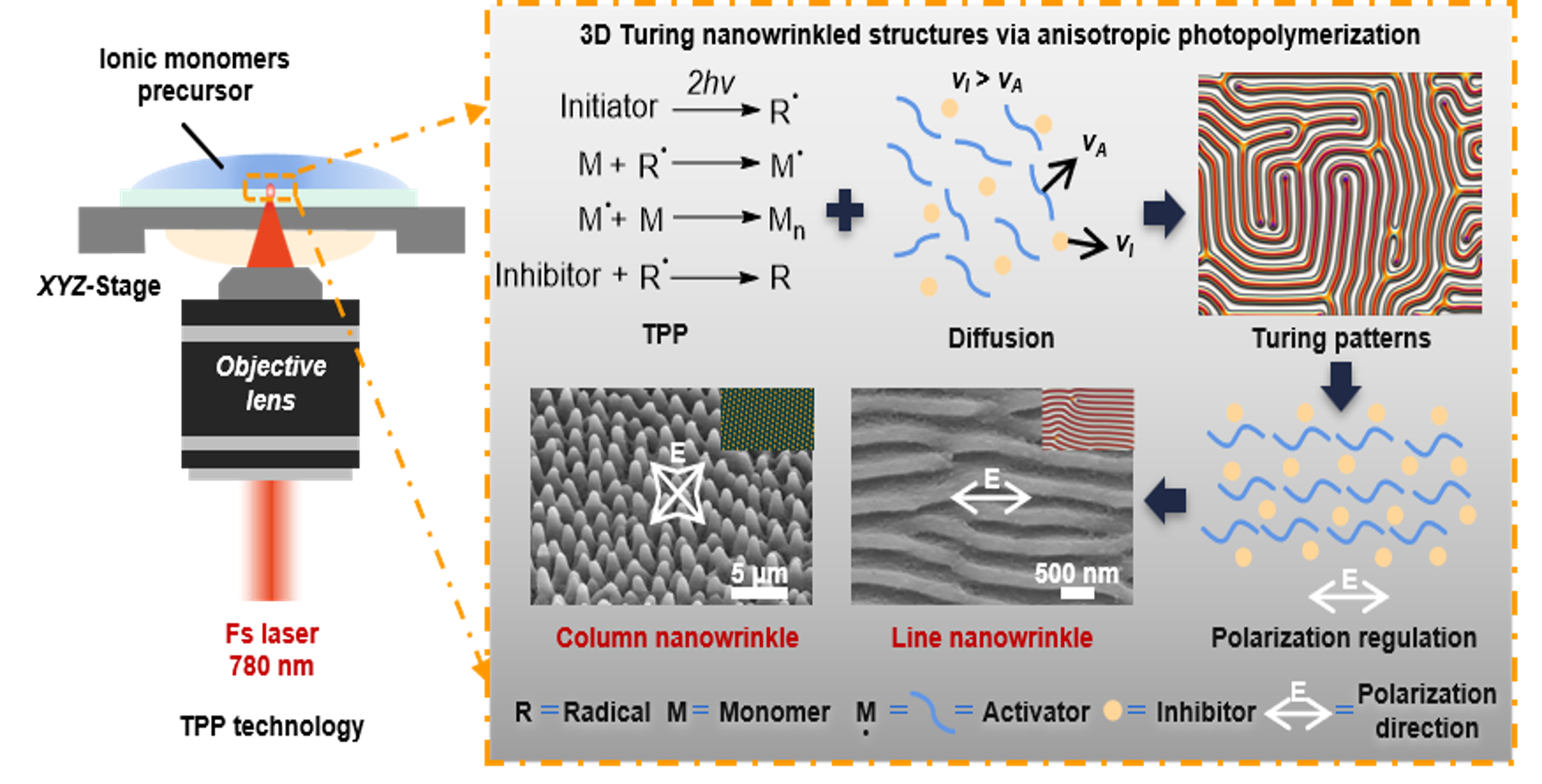 图2 飞秒激光偏振控制各向异性光聚合制备3D图灵纳米褶皱机理