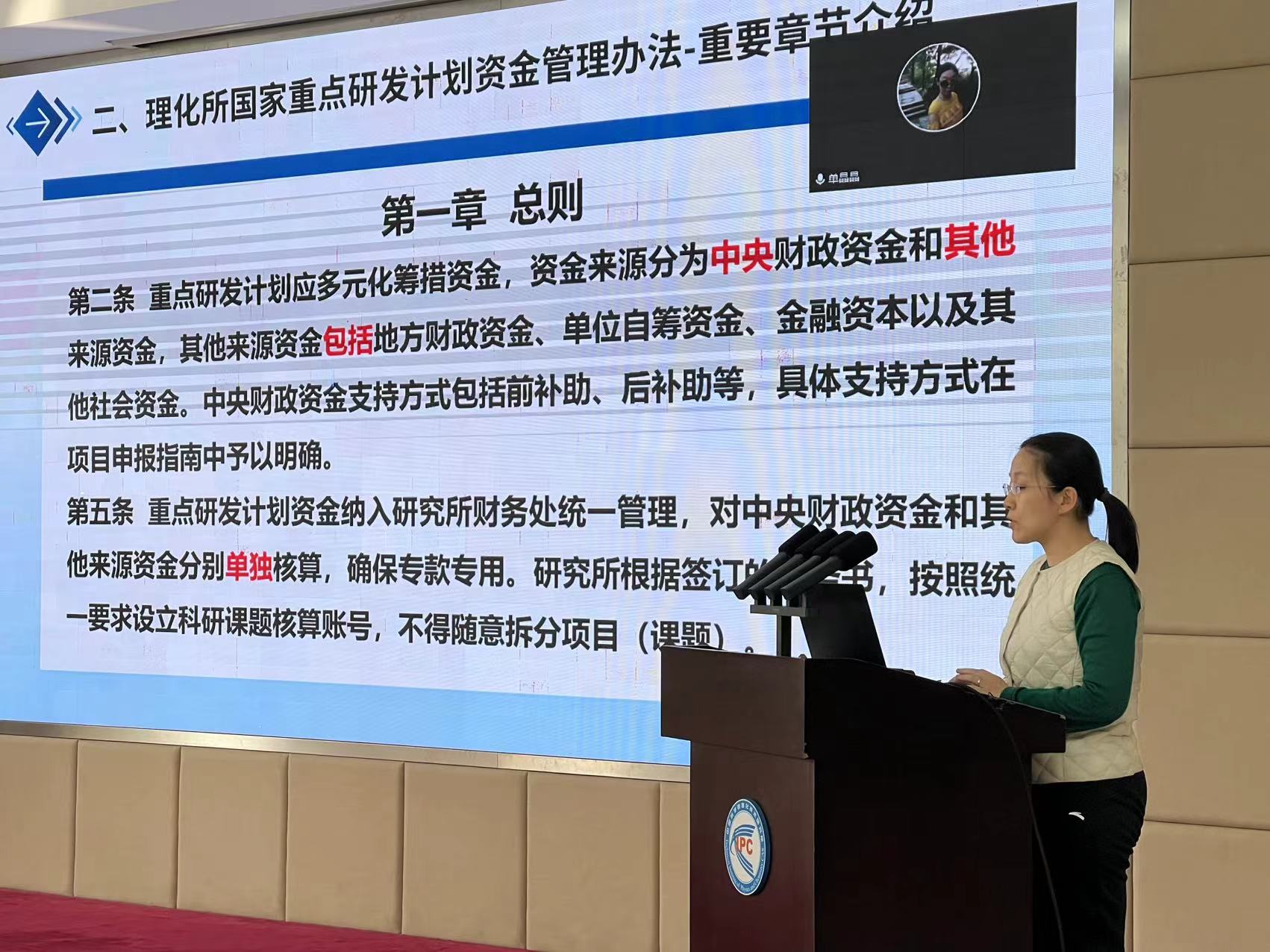 为深入贯彻落实国家科研经费管理政策,提升研究所重大科研项目经费管理的规范性与使用效益,10月28日下午,理化所财务处与科技处在1号楼407会议室联合举办国家重大科研项目经费管理专题培训会。会议采用线上线下结合方式,全所各实验室项目负责人、科研骨干、科研财务助理及管理部门人员120余人参加。财务处处长单晶晶主持会议。