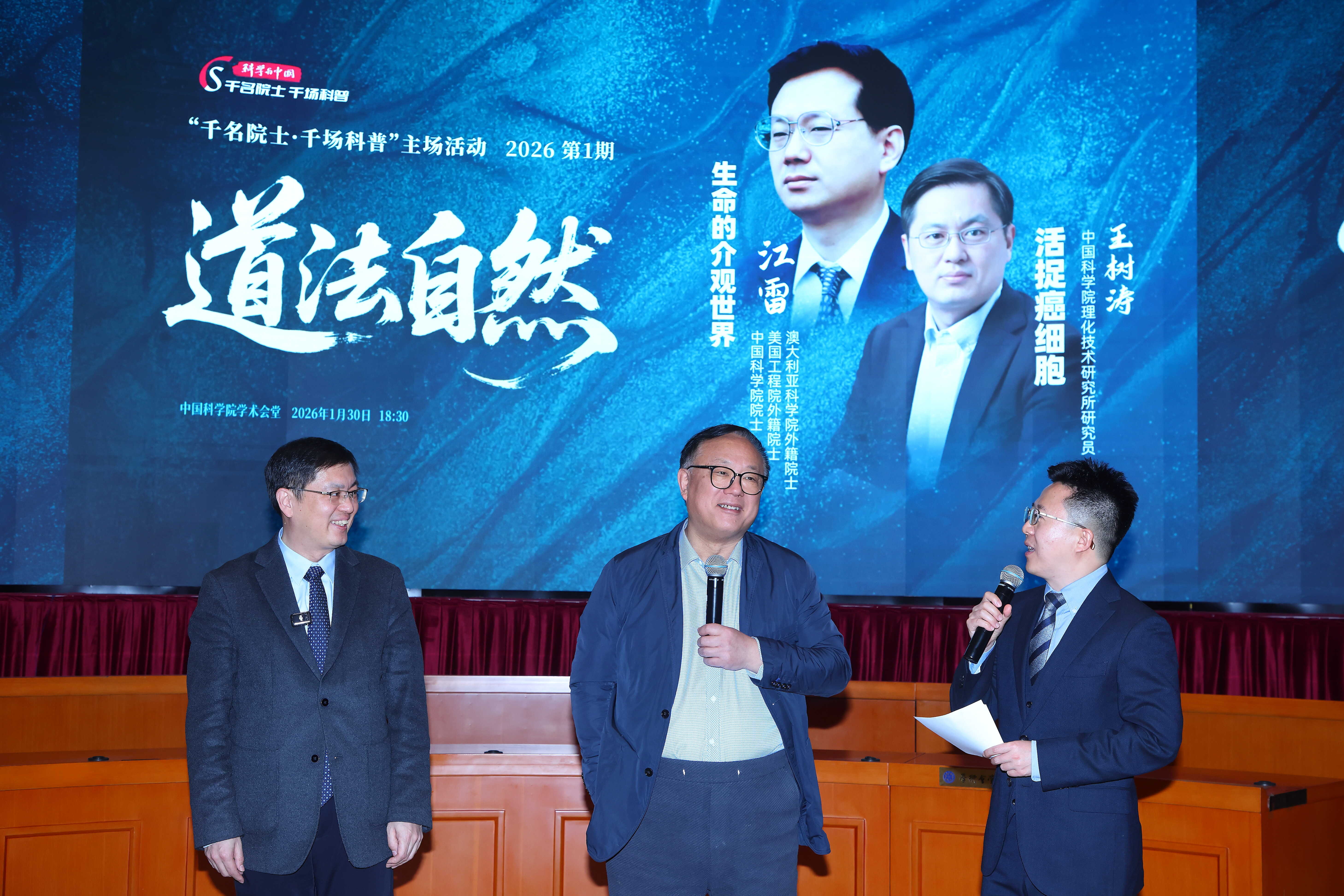1月30日,“科学与中国——千名院士·千场科普”2026年主场系列活动在中国科学院学术会堂拉开帷幕。中国科学院院士江雷、中国科学院理化技术研究所研究员王树涛受邀主讲,为现场300余名公众带来了一场兼具思想深度与通俗表达的前沿科普讲座。